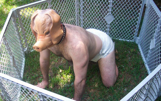 Now, he was little more than a mascot, often kept outside in a small pen, diapered, collared and masked, grunting and helplessly begging for his masters’ cocks up his ass or down his throat. Even worse, he loved it–he really did. In his new mind, he could imagine nothing better than his new life as an incontinent, pig slave.