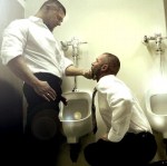 Bruce again tried to twist his head down and away, but Ivan’s gaze kept him locked. He sank lower towards the bathroom floor, dropping onto his knees, face level with Ivan’s bulging crotch, and he felt the piss he’d been storing up all day at his desk release into the front of his pants, the fabric wet and sopping almost immediately, a puddle growing out from his knees. He whimpered, but couldn’t speak.