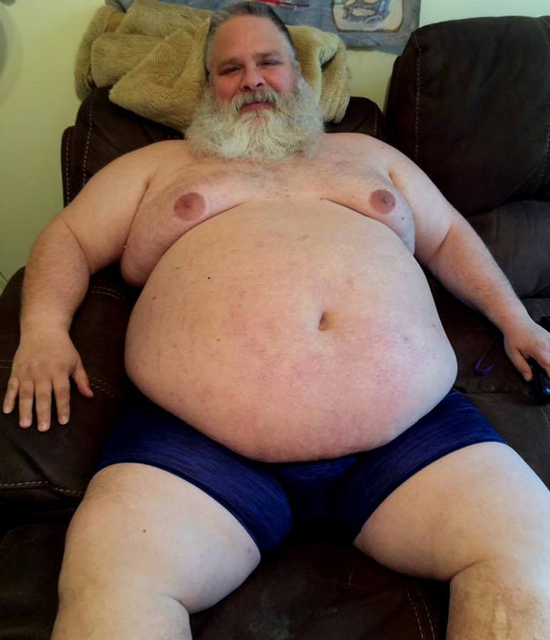 Ken woke up the next morning and surveyed the destruction of his long night out with Eddie. His gut had diminished as he’d slept, but not my that much. He dug out an old scale he hadn’t used in a while from under the bathroom sink, weighed himself, and was shocked to see that he was 280 pounds–and from the looks of it, he had gained another inch or two, putting him at nearly six feet four inches tall. His beard was caked with cum, he stank of musk and cigar smoke, and as much as he wanted to be disgusted by himself, he was just horny–he hauled out his big cock from the stained briefs he’d crawled into bed, sat down in front of the computer, pulled up some porn and got to work on his first load of the morning.