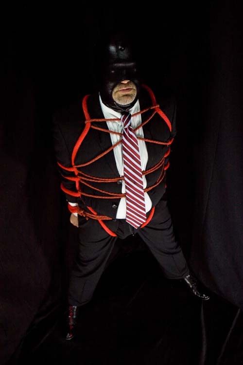 Down the stairs, and there he was. Ropes tied meticulously over his suit, tie over the top, bound to a post behind his back. Legs wide. Eyes wide with anger…and a bit of fear. I didn’t want to see the eyes, I hate the fucking eyes. I go over to the toolkit Rod’s provided me with, a present that came with the dungeon, pull out a hood, walk over and pull it down over his head, watching the leather suck against his skull, clamping under his chin and around his neck, shutting his mouth. He struggles, I watch. stubble growing along his bare mouth…I tease it with my bearded lips, listen to him let out a deep, guttural moan of desire, and kiss him, feed him smoke for a few minutes. He begs for a few minutes, pleading with me to not take his mind, but then…just grunts, bucking against the post.