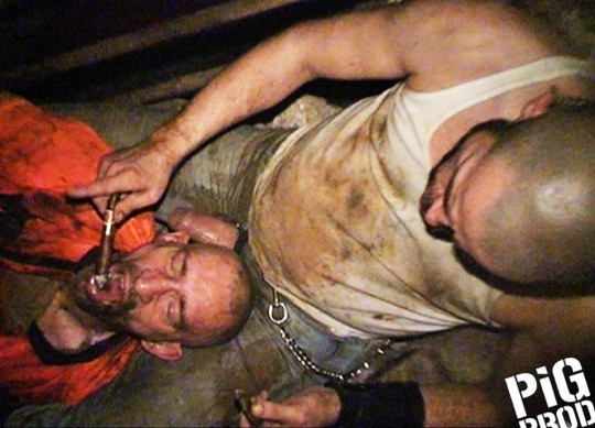 What Luke saw in the darkness there made his gasp. There, sitting on a couch–yes, it was Jason, but not the Jason he knew. Thickly muscled, covered with tattoos and piercings, wearing nothing other than a filthy, tattered jockstrap hiding an obscene, inhuman bulge, and two combat boots on his large feet. That was bad enough. It was the man before Jason, if you could call it a man, that was more terrifying. Covered with tattoos, with genitals that swollen into something gargantuan, he was bouncing up and down on a massive dildo on the ground in front of Jason. He could see as well that two carabiners had been attached to the massive rings in his nipples and his junk, and then suspended from the ceiling by a number of bungee cords. The man was oblivious to the world, lost in some filthy, degrading stupor.