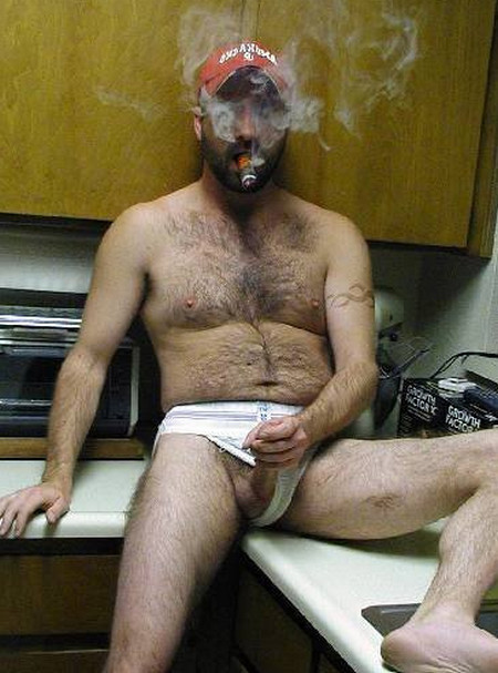 Heading downstairs to make breakfast before work, you smell smoke coming from the kitchen. Panicking, you rush in to see if something is on fire, and stop dead in your tracks–there, sitting on the counter in nothing more than a jockstrap, is a hairy man smoking a cigar, belching massive amounts of smoke into the room.