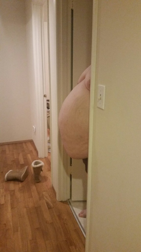 After their massive dinner, a few belly rubs in the kitchen, the two of them headed to bed, and feeling sexy, Jerry took a selfie of himself in the mirror to send to a few fellow gainers later. There, on the bookshelf was the spell book, but in the morning, it had disappeared, gone elsewhere to tempt another soul.
